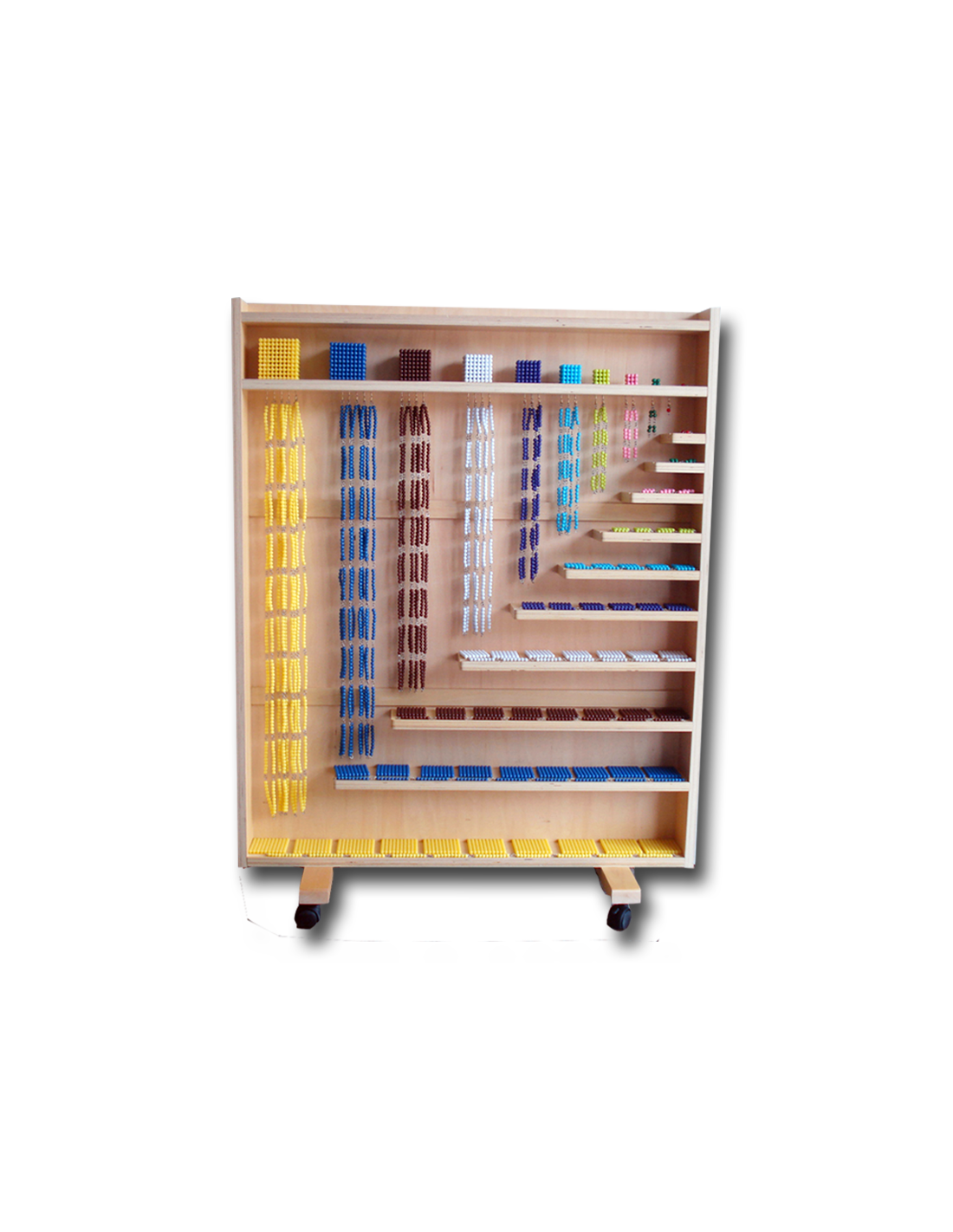 Complete Bead Materials with Rack is a extensive set of bead material is used for the exercises of linear and skip counting the quantities of the squares and cubes of the numbers 1-10. lt prepares the child for later activities in multiplication, squaring, and cubing, as well as a base number work. Recommended for children ages 3-12.